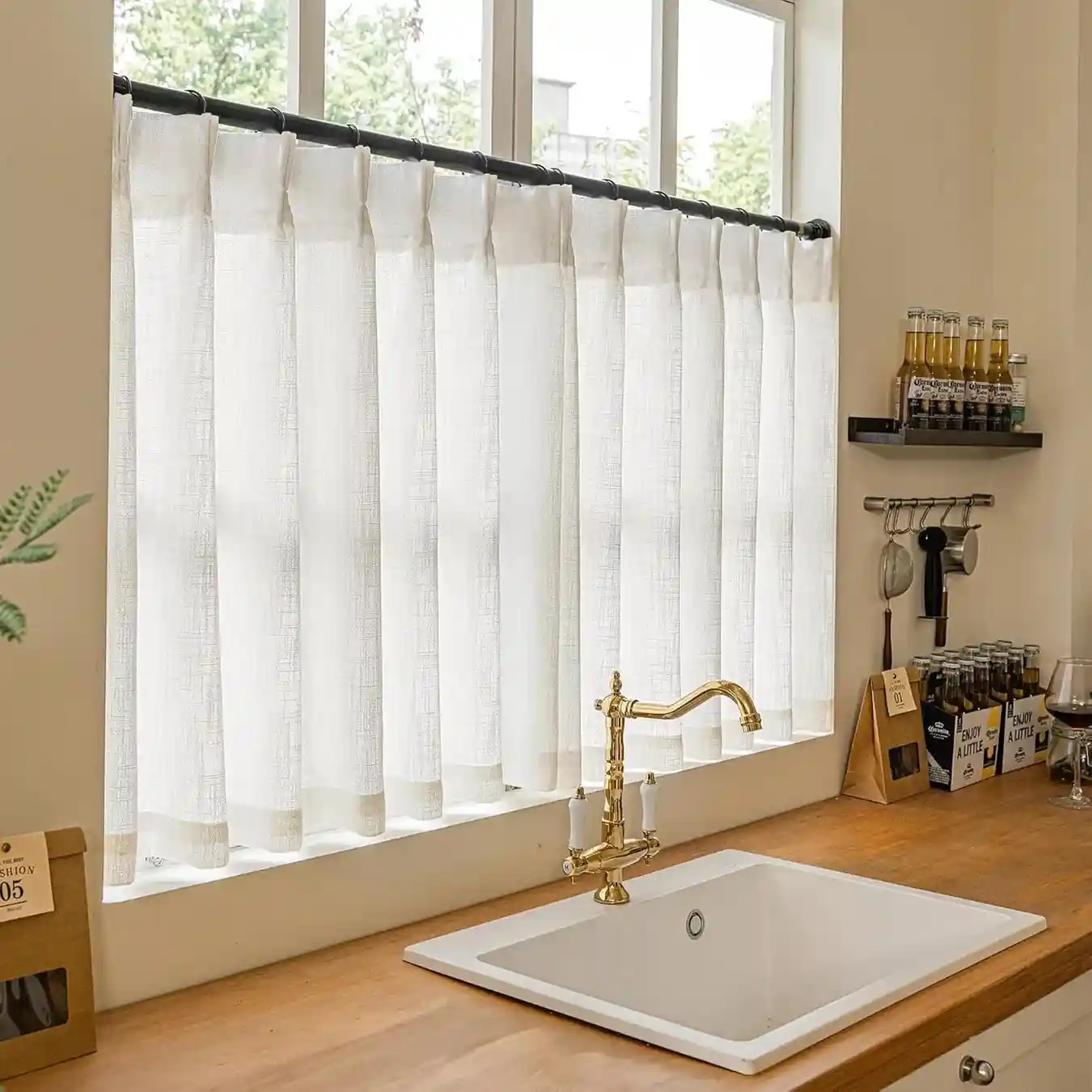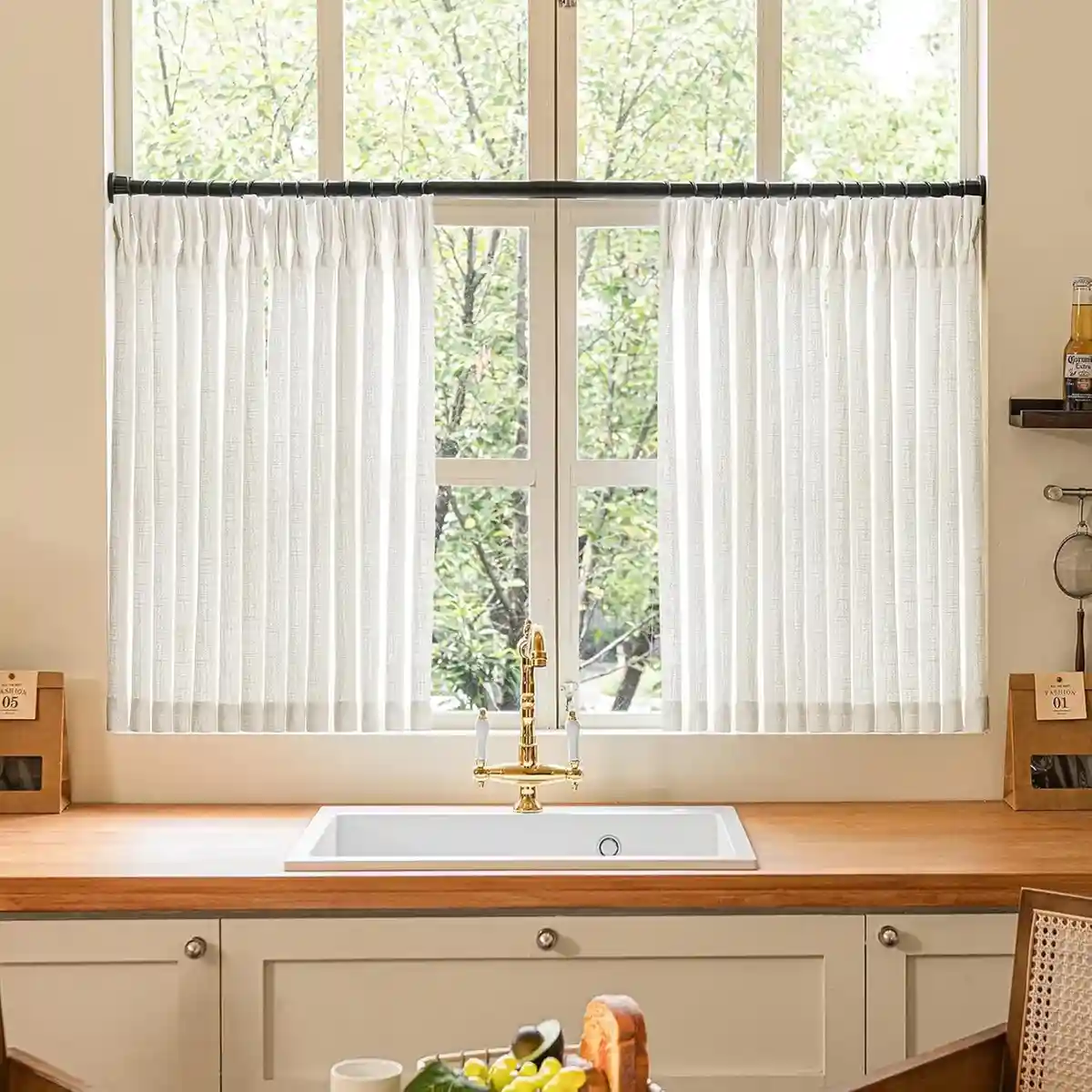 Upgrade your kitchen with our 36-inch pinch pleated sheer curtains. This two-panel set offers a tailored look while filtering light beautifully to ensure privacy and a bright, airy atmosphere.